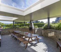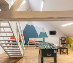 De accommodatie bestaat uit 3 verdiepingen. Op de begane grond vind je een ultramoderne, compleet ingerichte keuken, eetkamer en een woonkamer met houtkachel. Verspreid over niveau 1 en 2 vind je 8 slaapkamers en 7 badkamers. De ontspanningsruimte met een sauna en een speelkamer met tafelvoetbalspel, zijn beschikbaar op de tweede verdieping.