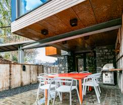 Dit vakantiehuis toont zich van zijn origneelste kant dankzij de moderne architectuur en de grafische inrichting. De mix van cortenstaal, hout en steen straalt in ieder geval karakter uit. En ook de decoratie mogen we gerust gedurfd noemen: muren bekleed met oude kranten en vinylplaten, een 'verborgen' kinderkamer achter een geheime deur, de tuin die toegankelijk is via een loopbrug ...  Overdag baadt de keuken in het licht dankzij het grote schuifraam met zicht op het platteland en toegang tot de tuin. Daaronder ligt het overdekte terras, waar je dus ook bij slecht weer buiten kunt zitten. 's Nachts stralen de kamers een en al rust en gezelligheid uit: zowel de ouders als de kinderen zullen er geen genoeg van krijgen!