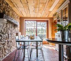 Het is een ruim en helder vakantiehuis met in elke kamer een andere sfeer. In het oude gedeelte van de vakantiewoning heerst er met de lage plafonds, het hout en de ongepleisterde stenen een gezellige sfeer in de uitgeruste keuken die uitloopt in een kleine eetkamer en een zithoek met cassettehaard. In het bijgebouw, het meest recente gedeelte van het vakantiehuisje, baad je dan weer in het licht. Je hebt daar een tweede zithoek met een grote hoekzetel, een tv en een cassettehaard. En dan is er nog de prachtige glazen koepel met een mooie, grote eetkamer om elk seizoen te genieten van het uitzicht en de tuin.