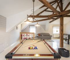 Dit landhuis voor 8/12 personen biedt voldoende ruimte voor een groepsvakantie met familie of vrienden. Op de eerste verdieping vind je 4 mooie en comfortabele slaapkamers, die elk beschikken over hun eigen badkamer. Een 5de kinderslaapkamer vind je op de tweede verdieping, vlak naast de geweldige speelzaal met biljarttafel en voetbaltafel. De zitkamer baadt in een buitengewone sfeer door de bijzonder verzorgde inrichting en het kwaliteitsvolle meubilair. De eetkamer is ruim en heel warm ingericht. Ze komt rechtstreeks uit in de open keuken, die zo goed is uitgerust dat je je chef-kok waant. Bovendien genieten alle gasten ten volle van de grote ontspanningsruimte met zwembad, sauna en jacuzzi. Ten slotte, kan je in de tuin heerlijk barbecueën op de twee grote terrassen, waarvan één overdekt is.