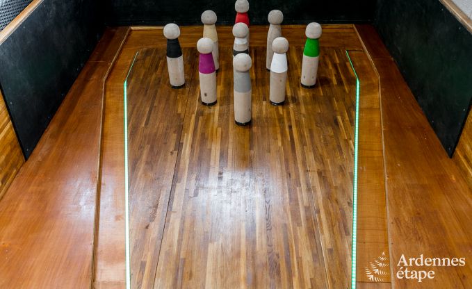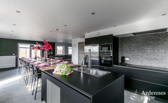 In dit modern vakantiehuis zal jong en oud volop genieten. Is het weer iets minder? Niet getreurd: in de gigantische speelruimte kunnen jullie biljarten, een darts of tafelvoetbaltoernooi organiseren en zelfs bowlen. Zin in rust? Laat de haard knisperen en nestel je met een goed boek in de uitnodigende zetel. Of misschien geniet je liever van een warm bubbelbad na een verkwikkende wandeling? Klink daarna op de mooie herinneringen die jullie hier aan het maken zijn en tover het keukeneiland om in een buffet. Lekker makkelijk en altijd feestelijk! Wat wordt het: een uitgebreide zondagsbrunch of een kaasavond met bijpassende streekbiertjes?