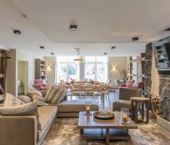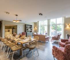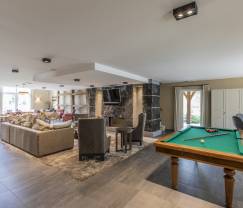 De ruime woonkamer is open, maar wel verdeeld in verschillende zones: twee zithoeken (waarvan één met houtkachel), twee eetkamers en een biljarttafel...