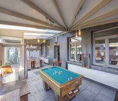 Dit grote vakantiehuis garandeert een heerlijk verblijf voor een grote familie of voor de teambuilding van een bedrijf. Met een eigen badkamer en tv een geniet iedereen in de eigen kamer van het gewenste comfort en privacy. Enkele kamers bevinden zich op de benedenverdieping, ideaal dus voor personen met beperkte mobiliteit. In de gezamenlijke ruimtes staat gezelligheid en gezamenlijke beleving centraal. Zo beschikken jullie over een immense eetkamer, een professionele keuken en enkele zitkamers met tv, waaronder een met open haard. Speelvogels zullen hun hartje ophalen in de speelkamer met een heuse airhockey, een voetbaltafel, een biljart en een pingpongtafel. Napraten na de dagactiviteiten kan in de aparte bar, waar op een tweede biljart ook een potje gespeeld kan worden. Biljarters zullen trouwens nooit op een tafel moeten wachten want in de eetkamer staat er nog een derde exemplaar!