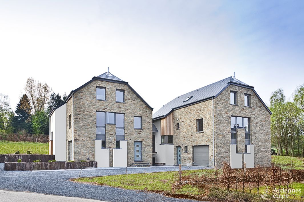 Deze groepsaccommodatie onderscheidt zich door zijn sobere elegantie en is het ideale optrekje voor een groep tot en met 17 personen. De vakantiewoning bestaat eigenlijk uit twee onafhankelijke woningen die via een ontzettend praktisch en overdekt sas met elkaar in verbinding staan. In de ene woning kunnen 8 gasten verblijven, in de andere 9. Je zult over een maximum aan comfort beschikken want beide huizen hebben hun eigen leefruimte met zitkamer, eetkamer en uitgeruste keuken. Het charmante meubilair en de verrukkelijke volumes zorgen ervoor dat je je tijdens je vakantie echt thuis voelt. Samenkomen bij de haard, culinair aperitief, sauna of partijtje kicker (betalend)…zet het allemaal op de agenda! Er zijn 3 slaapkamers in het ene huis en 4 slaapkamers in het andere. Alle 7 slaapkamers zijn als knusse nestjes mooi ingericht. Buiten zul je genieten van de grote tuin van 1600 m² die gedeeltelijk omheind is en een boomrijk park van 7500 m². De kinderen zullen hier volop kunnen ravotten! De volwassenen kunnen plaats nemen op de twee goed gelegen terrassen en bij mooi weer de barbecue aansteken.