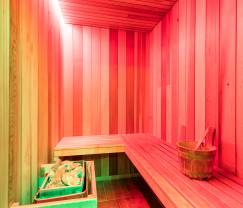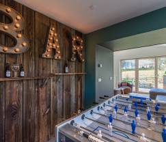 We vervolgen het bezoek met een paar stappen omhoog om de lounge te bereiken die toegang geeft tot de speelruimte met tafelvoetbalspel. Hier vind je ook de ontspanningsruimte met sauna, stoombad, douche en apart toilet.