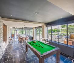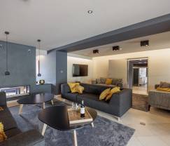 Als je deze enorme luxevilla met zijn eigentijdse inrichting binnenkomt, weet je niet waar eerst gekeken. Zo beschik je naast de 10 smaakvol ingerichte slaapkamers, elk met een eigen badkamer. En daarnaast over een groot aantal loungeruimtes, waaronder een grote woonkamer met tv en houtkachel. Ontspannen na een dagje in de natuur? Daarvoor heb je ruimschoots de keuze: de biljartkamer of de speelkamer met tafelvoetbal, darts, kinderspelletjes en gezelschapsspelletjes. Kom je om te werken? Je beschikt over een grote vergaderruimte met overheadprojector, scherm en flipchart. Tijd om aan tafel te gaan? Dan gaat het richting de professionele keuken voor je plaatsneemt in de grote, lichte eetkamer met panoramisch uitzicht op de omgeving. Of misschien barbecue je liever op het ruime terras, nadat je hebt genoten van de enorme, prachtige tuin en een duik hebt genomen in het verwarmde buitenzwembad? Er is privéparkeergelegenheid voor 10 auto's.