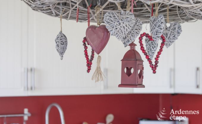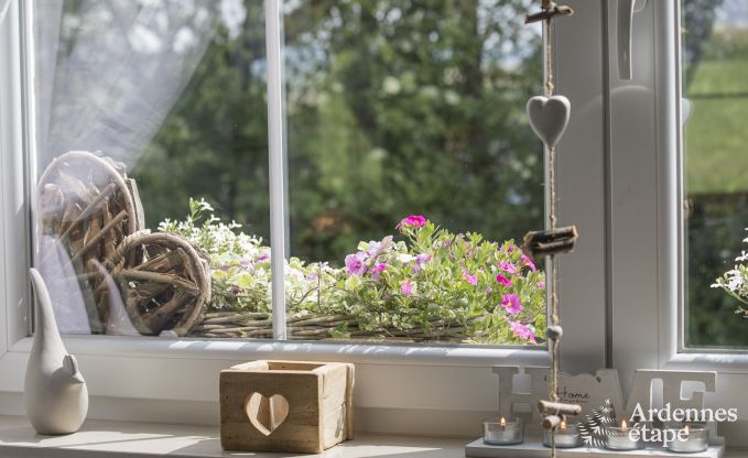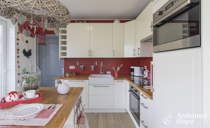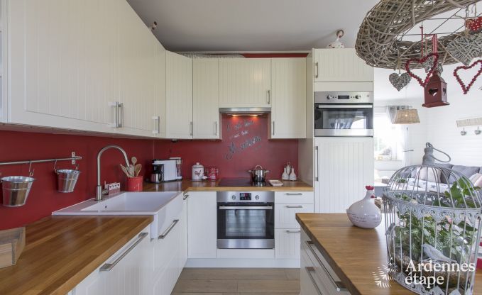 Geen gebrek aan ruimte, maar ook niet aan rust in dit vakantiehuis met een privétuin van 700 m² midden in het groen. Het ideale speelterrein voor de kinderen (want de tuin is helemaal omheind) en de perfecte plek om te ontspannen voor de hele familie. In de zomer kan je zelfs samenkomen rond de barbecue voor gezellige grillavonden. Binnen ontdek je een betoverende inrichting en uiterst aangename kamers waar het heerlijk vertoeven is. Zeker in de grootste leefruimte die een warme sfeer uitstraalt. Er is een knusse zithoek met comfortabele zetels dicht bij de houtkachel en ook een ruime eetkamer met veel lichtinval waar je samen kunt tafelen. In de keuken is alles aanwezig wat je nodig hebt om de familie te verwennen. De volledige uitrusting bevat zelfs een croque-monsieurtoestel en een Senseo koffiezetapparaat. Het huis telt ook een badkamer en 3 slaapkamers op de eerste verdieping.
