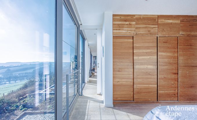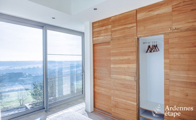 Dit schitterende vakantiehuisis een mooi voorbeeld van hedendaagse architectuur. De combinatie van strak hout, ruw steen, rechte lijnen, grote raampartijen en een stijlvolle inrichting, maken dit verblijf tot een heus pareltje onder de vakantiehuizen. Tel daar het adembenemende uitzicht bij op en je vindt hier alles voor een heerlijke vakantie. De 4 sterren accommodatie biedt ruimte aan acht personen, en kent een zeer smaakvolle inrichting. De huiselijke details, zoals het servieskastje, schilderijtjes, een vaas met bloemen en kleedjes, maken dat je je direct thuis voelt. In de knusse woonkamer met kabeltelevisie, dvd-speler, hifi-installatie en Homecinema set, springt de hangende openhaard direct in het oog. Een echte eyecatcher die de hele leefruimte een gezellige, warme sfeer geeft. De aangrenzende eetkamer, met panoramisch uitzicht over de omgeving, is een van de mooiste plekjes in dit vakantiehuis. Vooral als het zonlicht binnenvalt, is het op en top genieten. Verder telt het vakantiehuis vier slaapkamers en twee badkamers, waarvan een met ligbad. Dompel jezelf onder in een heerlijk warm bad terwijl je ondertussen door het grote raam van de natuur geniet. Vanop het verhoogde en overdekte terras met tuinmeubilair geniet je van de adembenemende omgeving. En, niet te vergeten: vanuit de zwemvijver kijk je niet enkel uit op het unieke panorama maar ook op een fenomenale bloemenpracht.