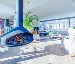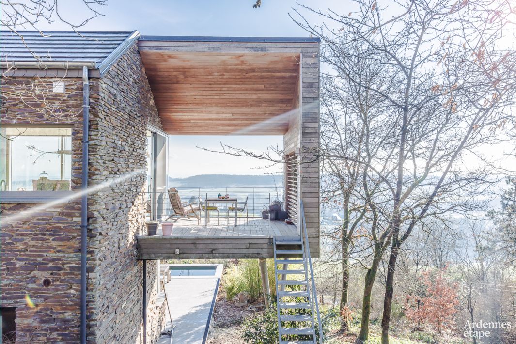 Dit schitterende vakantiehuisis een mooi voorbeeld van hedendaagse architectuur. De combinatie van strak hout, ruw steen, rechte lijnen, grote raampartijen en een stijlvolle inrichting, maken dit verblijf tot een heus pareltje onder de vakantiehuizen. Tel daar het adembenemende uitzicht bij op en je vindt hier alles voor een heerlijke vakantie. De 4 sterren accommodatie biedt ruimte aan acht personen, en kent een zeer smaakvolle inrichting. De huiselijke details, zoals het servieskastje, schilderijtjes, een vaas met bloemen en kleedjes, maken dat je je direct thuis voelt. In de knusse woonkamer met kabeltelevisie, dvd-speler, hifi-installatie en Homecinema set, springt de hangende openhaard direct in het oog. Een echte eyecatcher die de hele leefruimte een gezellige, warme sfeer geeft. De aangrenzende eetkamer, met panoramisch uitzicht over de omgeving, is een van de mooiste plekjes in dit vakantiehuis. Vooral als het zonlicht binnenvalt, is het op en top genieten. Verder telt het vakantiehuis vier slaapkamers en twee badkamers, waarvan een met ligbad. Dompel jezelf onder in een heerlijk warm bad terwijl je ondertussen door het grote raam van de natuur geniet. Vanop het verhoogde en overdekte terras met tuinmeubilair geniet je van de adembenemende omgeving. En, niet te vergeten: vanuit de zwemvijver kijk je niet enkel uit op het unieke panorama maar ook op een fenomenale bloemenpracht.