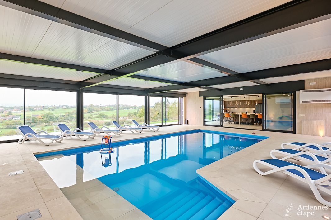 Deze luxevilla in Somme-Leuze is perfect voor groepen van 12 personen die samen willen genieten van een comfortabele en stijlvolle vakantie in de Ardennen. Gelegen aan het einde van een doodlopende straat, op de hoogten van het charmante dorp Noiseux, biedt deze villa een adembenemend panoramisch uitzicht over het omliggende platteland en het kerktorentje van het dorp. Dankzij de bijna volledig glazen gevels kan je deze prachtige omgeving bewonderen vanuit bijna elke hoek van het huis.