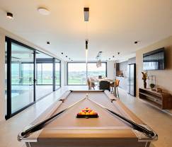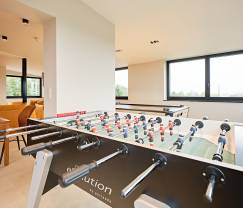 Een trap naar beneden brengt je naar de tuinverdieping, waar zich nog eens 3 tweepersoonskamers bevinden, elk met een eigen badkamer. Hier vind je ook een ontspanningsruimte met een infraroodcabine en een tweede leefruimte met een tweede volledig uitgeruste keuken en eetkamer. Zo kan je op verschillende momenten van de dag in verschillende sferen samenkomen. Vanuit deze leefruimte heb je zicht op het binnenzwembad, waar de kinderen kunnen spelen terwijl de volwassenen genieten van een drankje en een potje biljart (of ook van het zwembad, natuurlijk).