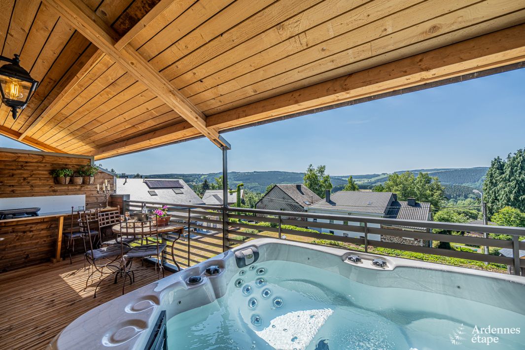 Deze prachtige chalet biedt een subliem panoramisch uitzicht op de vallei. En dat is niet zijn enige troef, want de eigentijdse en uiterst warme inrichting omhult je onmiddellijk in een gezellige sfeer. Hier vergeet je alles. Het enige waaraan je moet denken: van elk moment genieten. Zo zal je in de jacuzzi op je terras heerlijk nagenieten van een wandeling in de natuur. Je kan er trouwens ook opuit trekken met de 2 elektrische fietsen die je gratis kan gebruiken.
