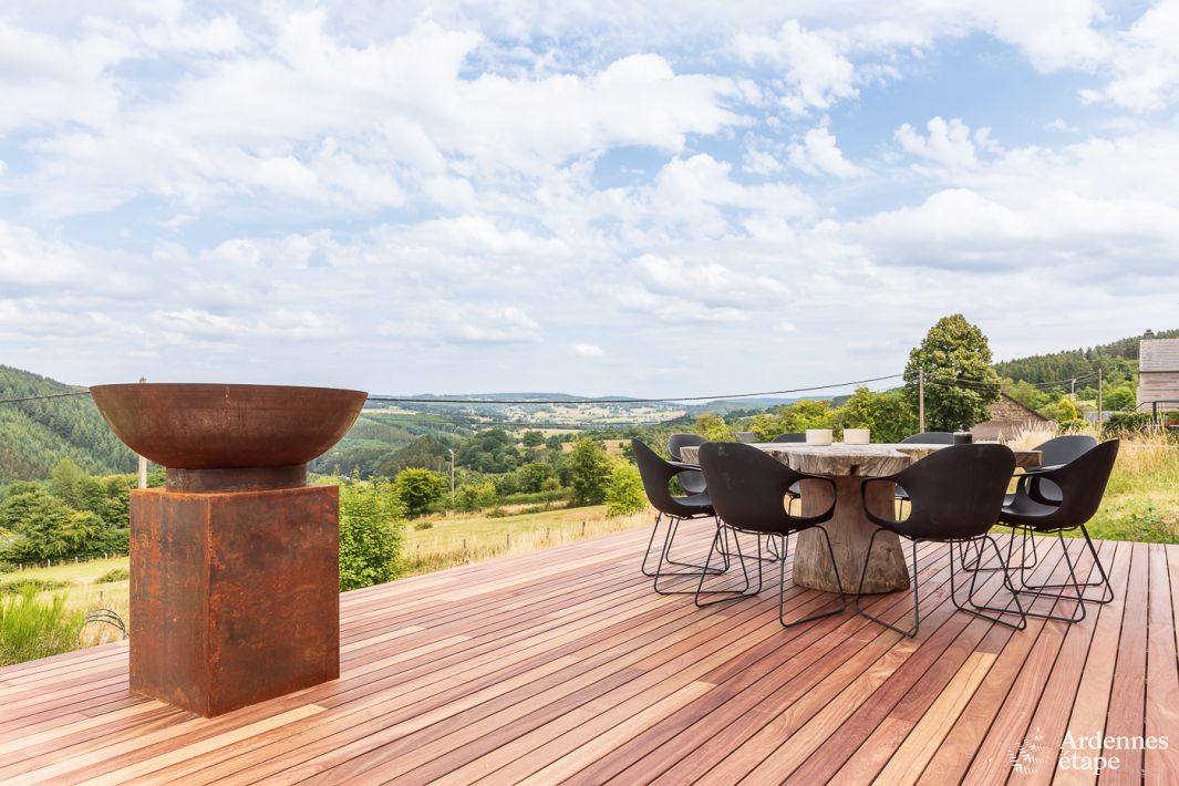 Puur genieten! Dat is dit luxueuze vakantiehuis in twee woorden. Maar eigenlijk kunnen we er een boek over schrijven. Dit grote vakantiehuis bekoort namelijk meteen met zijn stijlvolle interieur (stelen met de ogen mag!) en zijn adembenemende uitzicht (echt geweldig!). In de woonruimte, op het terras en zelfs in de slaapkamers word je overdonderd door een prachtig zicht op de Ardense natuur. Maar dat is nog niet alles! Er zijn 4 mooie slaapkamers met elk hun eigen badkamer, een biljarttafel voor gezellige avonden, een buitenjacuzzi met een prachtig uitzicht en een grote tuin waarin de kinderen mogen ravotten ...