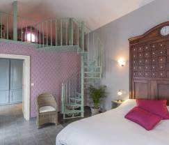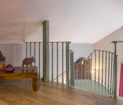 Van zodra je de drempel hebt overschreden, sta je in de keuken die uitgeeft op het terras. Als je verdergaat, kom je terecht in een slaapkamer waarvan de hoogte van de ruimte en het bed met het originele hoofdeinde je zullen bekoren. De trap in de kamer leidt je naar een zit- en leeshoek.