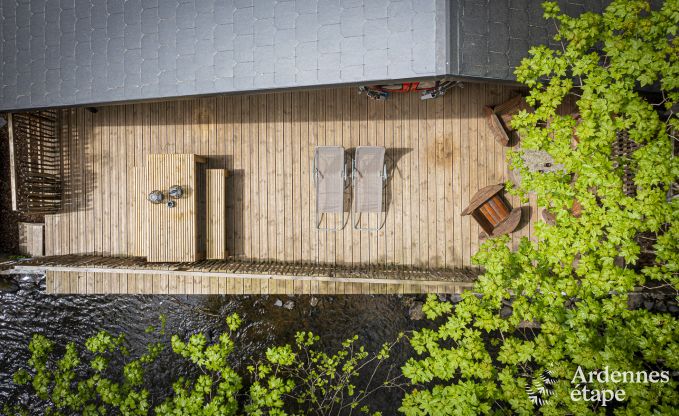 Buiten heb je een privéterras langs de rivier (zonder rechtstreekse toegang tot de rivier) en een privétuin met spellen voor de kinderen, een petanquebaan en barbecue. Het terras aan het water is een geweldige plek om te ontspannen en te genieten van de rustgevende geluiden van de natuur.
