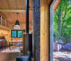 De chalet beschikt over 2 slaapkamers en 2 badkamers, ideaal voor een gezin of een enkele vrienden. Er zijn ook 2 honden welkom, zodat je je trouwe viervoeters niet thuis hoeft te laten. De woonkamer is uitgerust met een houtkachel, wat zorgt voor een knusse en warme sfeer. Voor de kinderen is er een speciale speelruimte binnen en een speeltuin buiten met een schommel, glijbaan en trampoline.