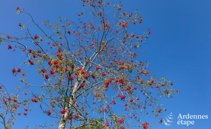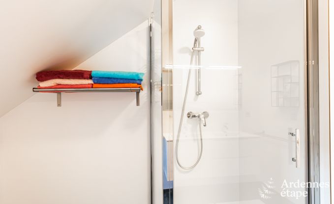 Door veel licht hout, witte muren en kleurrijke accenten in het interieur te verwerken, kreeg deze 3-sterren gite een frisse, vrolijke uitstraling. In de verlenging van de houten trap werd een leeshoekje voorzien met zicht op het bos. Dit is ook het ideale plekje voor kleintjes om nog wat te spelen terwijl jij in de keuken iets lekkers klaarmaakt. Vergeet wekkers en verplichtingen, hier ben je om het allemaal even rustiger aan te doen en op je eigen ritme – en dat van de natuur – te leven. In de zomer geniet je in de schaduw van de bomen van het heerlijke weer en kan je gezellig barbecueën.