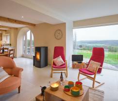 De woning is van alle gemakken voorzien, inclusief een moderne houtpelletkachel die zorgt voor een warme en gezellige sfeer. De privétuin en het privéterras met comfortabel tuinmeubilair bieden een prachtig uitzicht op de omliggende natuur, ideaal om te ontspannen en te genieten van de frisse lucht. Voor de liefhebbers van buiten koken is er een barbecue beschikbaar.