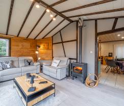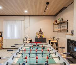 De woonkamer is een echte blikvanger, met zijn grote glazen wanden die zorgen voor veel natuurlijk licht en een prachtig uitzicht op de omgeving. En na een lange dag vol activiteiten, is er niets beter dan ontspannen bij de houtkachel of genieten van een spelletje darts of tafelvoetbal.