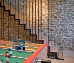 De woning beschikt over een volledig uitgeruste speelkamer, waar je je kunt uitleven rond de voetbaltafel. Voor de liefhebbers van een drankje is er een gezellige bar aanwezig, ideaal voor een avondje plezier met vrienden of familie. Het overdekte terras met comfortabel tuinmeubilair biedt de perfecte plek om te genieten van de frisse lucht, ongeacht het weer.