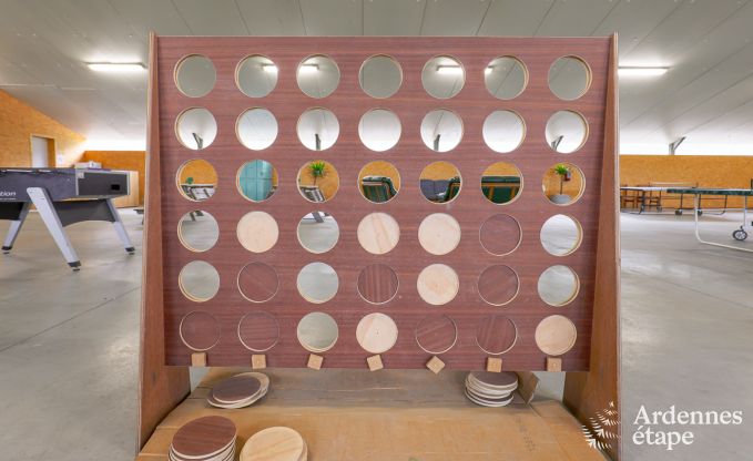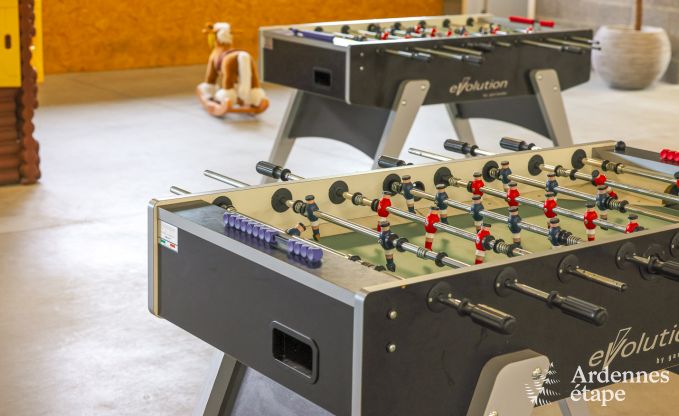 Geniet van een lekker ontbijt in de zuidelijk gerichte (gemeenschappelijke) tuin, van een gezellige spelavond bij het knisperende haardvuur of verken het bos op amper 1 kilometer van het vakantiehuis. Wat dacht je van een familietoernooi tafelvoetbal of ping pong? In een apart bijgebouw beschik je over een extra grote speelzaal die je zal delen met de huurders van de naburige vakantiehuizen. Een bar en knusse loungezetels maken het plaatje af. Een handige plus: in de speelzaal beschik je over twee extra toiletten.