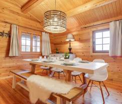Knus, houten chalet van alle gemakken voorzien. Alles ziet er netjes uit en geeft een gezellige en warme sfeer. Schitterend uitzicht. Vriendelijke eigenaar, we konden op de eerste dag wat eerder en op de laatste dag wat later uitchecken. Voor de slaapkamer met eigen badkamer moet je een trapje van ca. 5 treden af. Het bed daar heeft een behoorlijk hard matras. Wij hebben veel aan de eettafel gezeten, daaraan hadden wel wat meer comfortabele stoelen mogen staan ipv deze stoelen en houten bank.