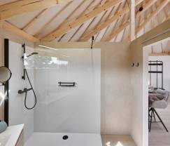 Binnen vind je een gezellige slaapkamer en een moderne badkamer, ideaal voor een comfortabel verblijf. Het bed is bij aankomst al opgemaakt, zodat je meteen kunt ontspannen zonder zorgen. Voor de allerkleinsten is er een babybedje en een kinderstoel beschikbaar. De inrichting straalt een warme en huiselijke sfeer uit, vergelijkbaar met een hotelverblijf, maar dan met de charme van een natuurhuisje.