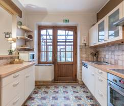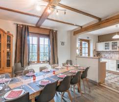 Binnen in het huis vind je een warme inrichting met bijvoorbeeld deze woonkamer uitgerust met een cassettehaard, ideaal voor gezellige avonden, of de grote eetkamer met deze grote tafel om gezellige momenten te delen. De keuken is volledig uitgerust en klaar om heerlijke maaltijden te bereiden. Het huis heeft 5 slaapkamers en 3 badkamers, wat voldoende privacy voor iedereen garandeert. En voor de kleintjes zijn er 2 babybedjes en 2 kinderstoelen.