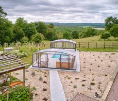 Het overdekte buitenzwembad, de sauna en de jacuzzi worden door meerdere woningen gedeeld.