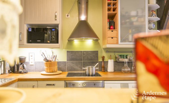 Zeer charmant 3.5-sterren vakantiehuis voor maar liefst 9 personen in Vresse-sur-Semois, provincie Namen. De gite kent een zeer sfeervolle inrichting dankzij het veelvuldig gebruik van hout als materiaal. De lichte woonkamer met aangename houtkachel, comfortabele banken en televisie met satellietontvangst en Dvd-speler, is een heerlijke ruimte om 's avonds tot in de late uurtjes te genieten van een goed boek of gezelschapsspel. De woonkamer staat in open verbinding met de eethoek, vanwaar je weer zicht hebt op de prachtige, volledig uitgeruste keuken. Deze is heerlijk ruim qua opzet en beschikt onder meer over een 4-pits elektrische kookplaat, oven, magnetron, koelkast en afwasmachine.