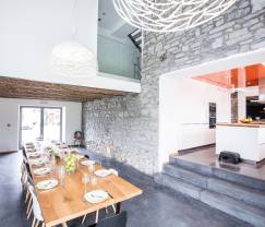 De keuken is de centrale ruimte van het huis en scheidt de grote zithoek en de eetkamer. Links van de keuken ligt de zithoek met als brandpunt de houtkachel en zicht op het terras en de tuin. Rechts ligt de eetkamer die eveneens op het terras, de tuin en het zwembad uitgeeft.